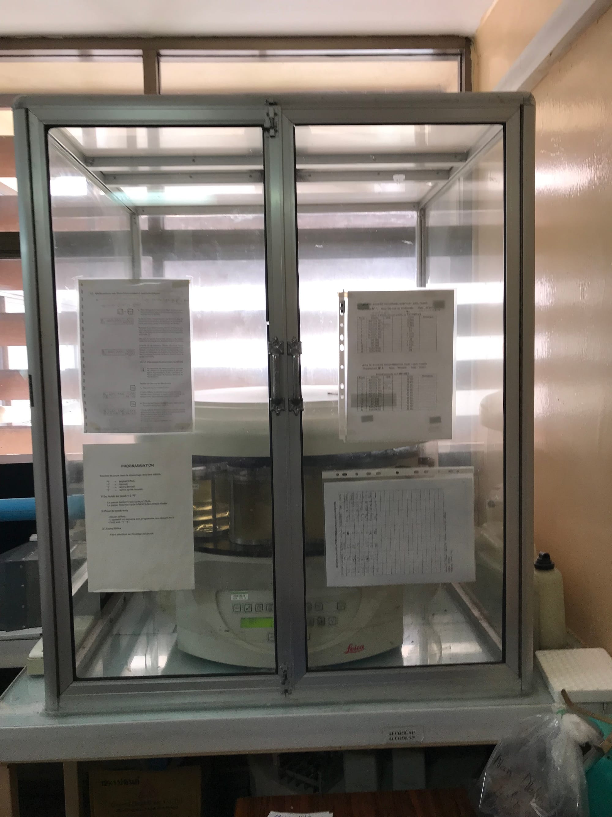 Une salle d'histologie avec du materiel Automatique ou semi automatique récupéré depuis 10 ans permet des examens de qualité et surtout le laboratoire dispose de personnel qualifié formé au quotidien par le Pr Pluot.